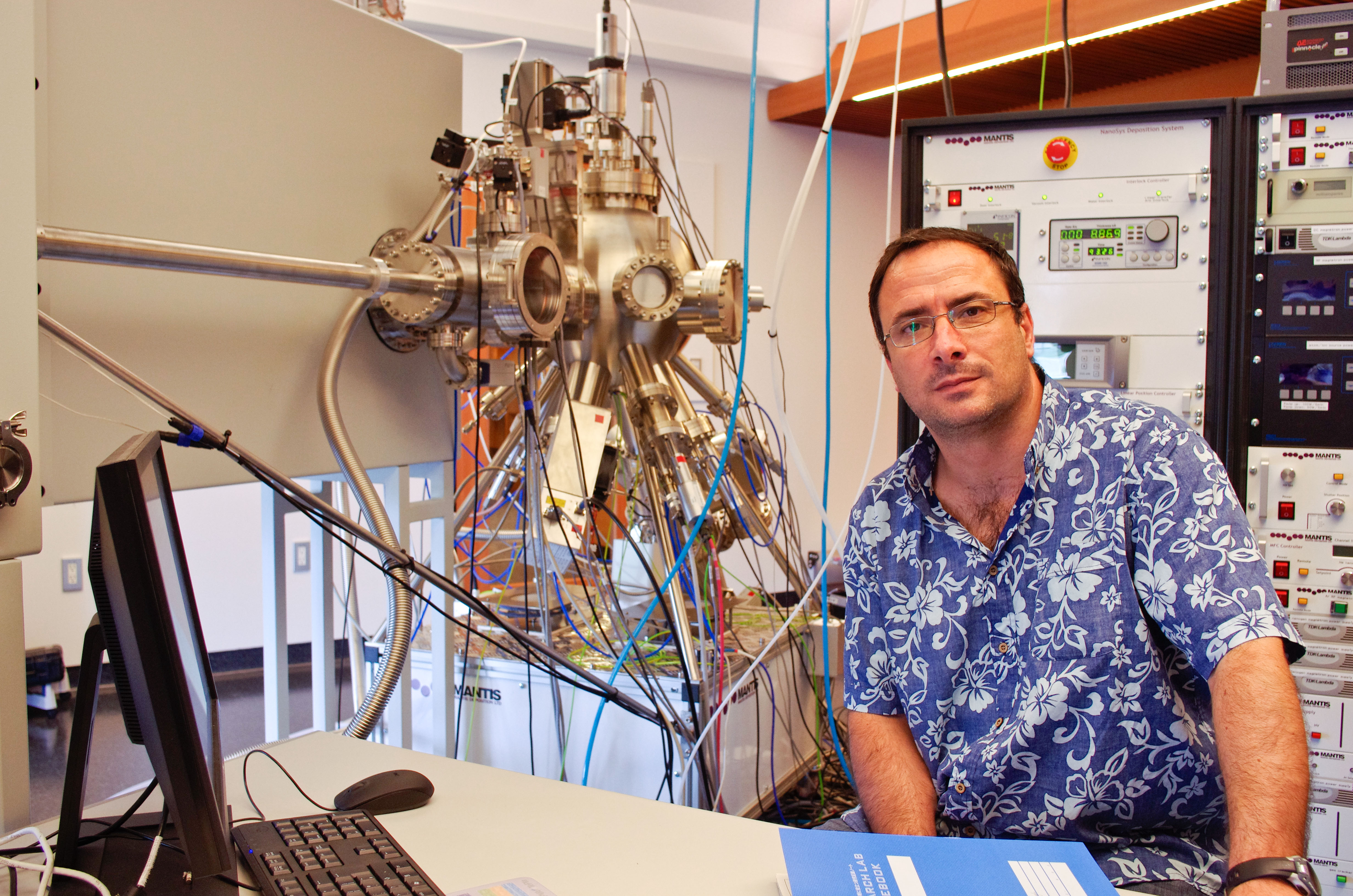 Professor Sowwan sits in front of a nanoparticle deposition system at OIST.