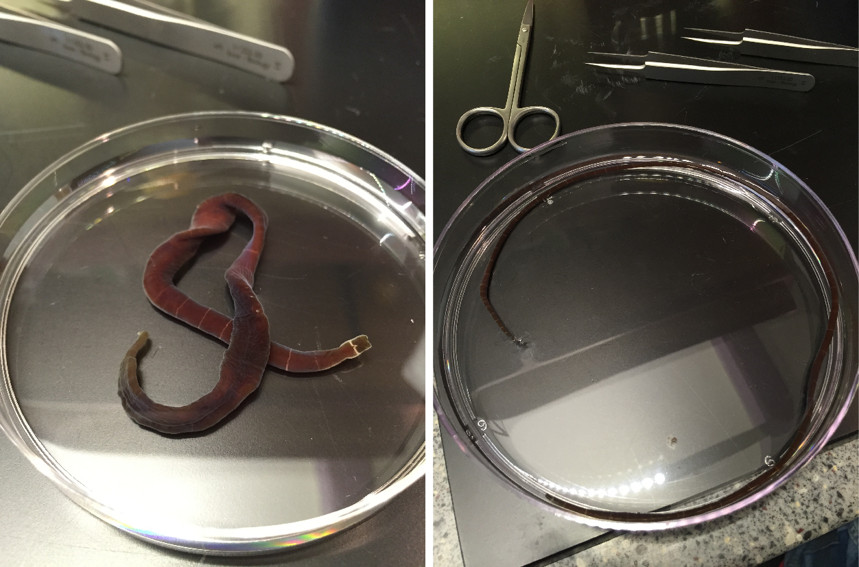 A nemertean worm (Notospermus geniculatus). Left: a contracted worm. Right: an extended worm. The nemertean body is usually highly contractible and extendable. Some nemertean species, such as Lineus longissimus, can reach 30m long.