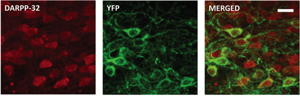 The first panel shows neurons, the second panel shows the neurons expressing the protein that make them sensitive to light, and the third panel is the first two merged together, showing which neurons are expressing the light-sensitive protein used to inhibit their activity.