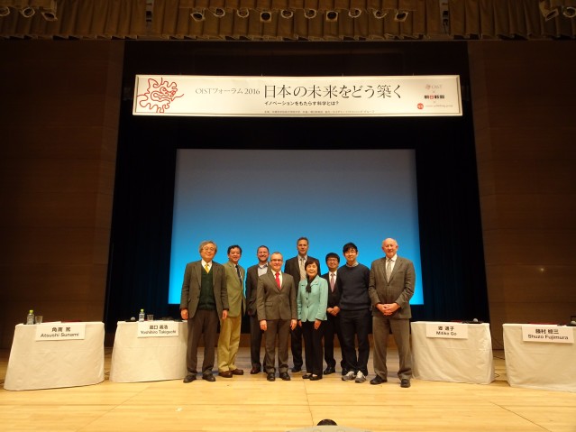 (From left to right) Prof. Shuzo Fujimura of Tokyo Institute of Technology’s Graduate School of Innovation Management, Prof. Yoshihiro Takiguchi of Researcher Central Research Lab at Hamamatsu Photonics K.K./Vice Provost, Graduate School for the Creation of New Photonics Industries, Dr. David Sundahl of Clayton Christensen Institute, Mr. Nick Campbell of Nature (center left), Mr. David Cyranoski of Nature Asia-Pacific, Prof. Mitiko Go of Nagoya University/Visiting and Distinguished Professor of Naghama Institute of Bio-Science and Technology (center right), Prof. Atsushi Sunami of National Graduate Institute for Policy Studies/Special Advisor to the Cabinet, Mr. Shunji Ukai, Ph.D. student of Graduate School of Education and Human Development, School of Education, Nagoya University, and President Jonathan Dorfan of OIST.