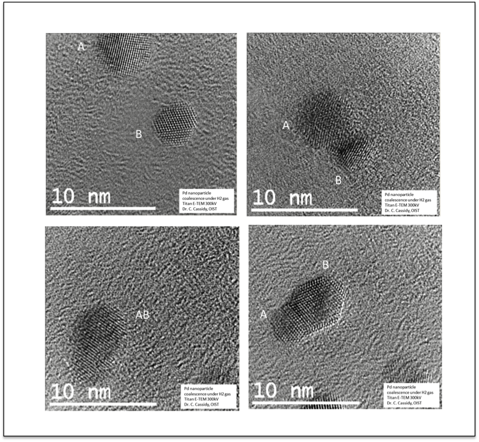Palladium nanoparticles in hydrogen gas as visualized in the Transmission Electron Microscope (TEM). The panels show two nanoparticles merging together to form one. In the first panel (upper-left), you can clearly see dots in nanoparticle B. These are columns of individual atoms, demonstrating the extreme sensitivity and high resolution of this microscope. These are freeze frames with reduced resolution extracted from a high-speed video.