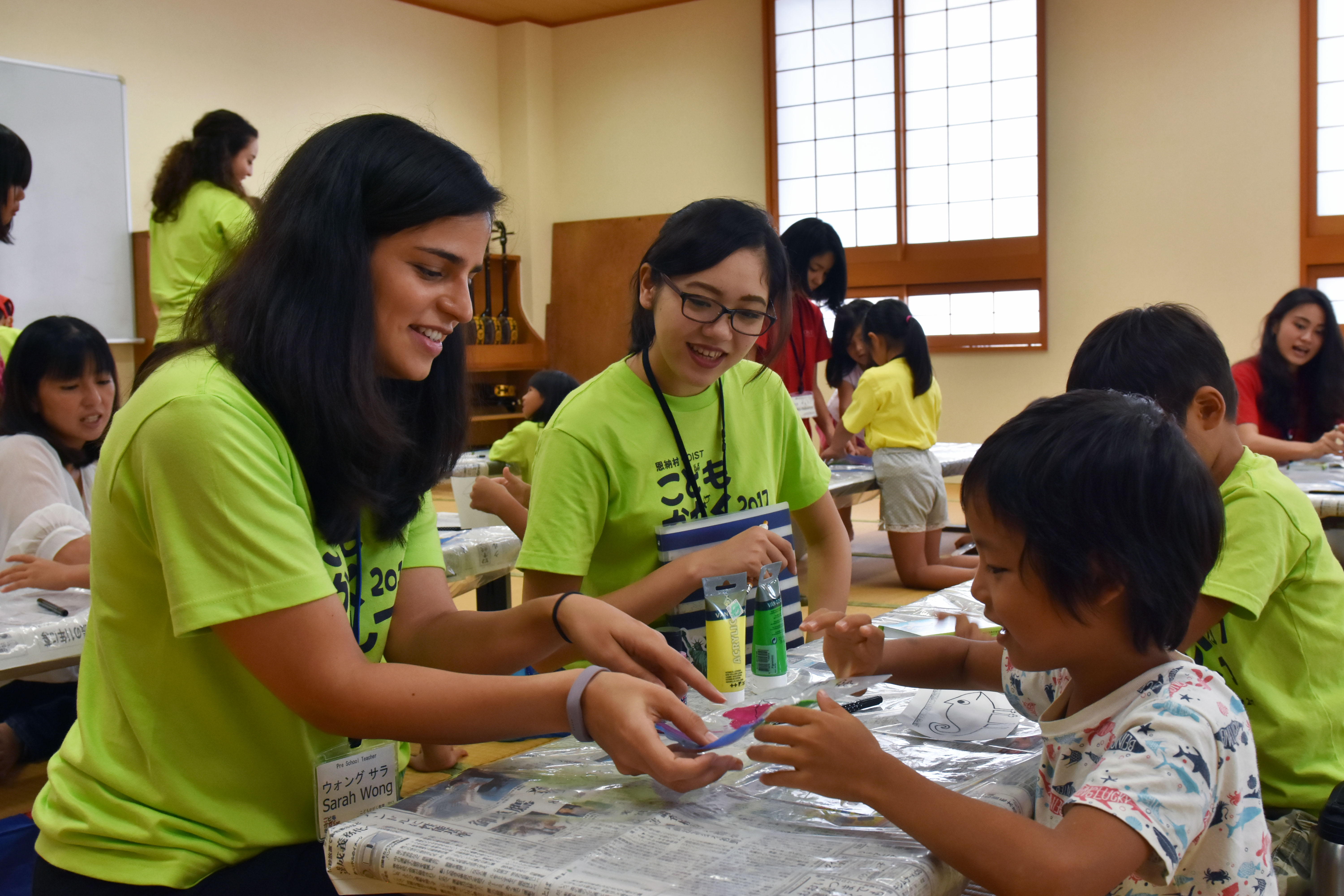 Preschoolers learning about mixing colors with OIST employee Sarah Wong and University of the Ryukyus intern Claire