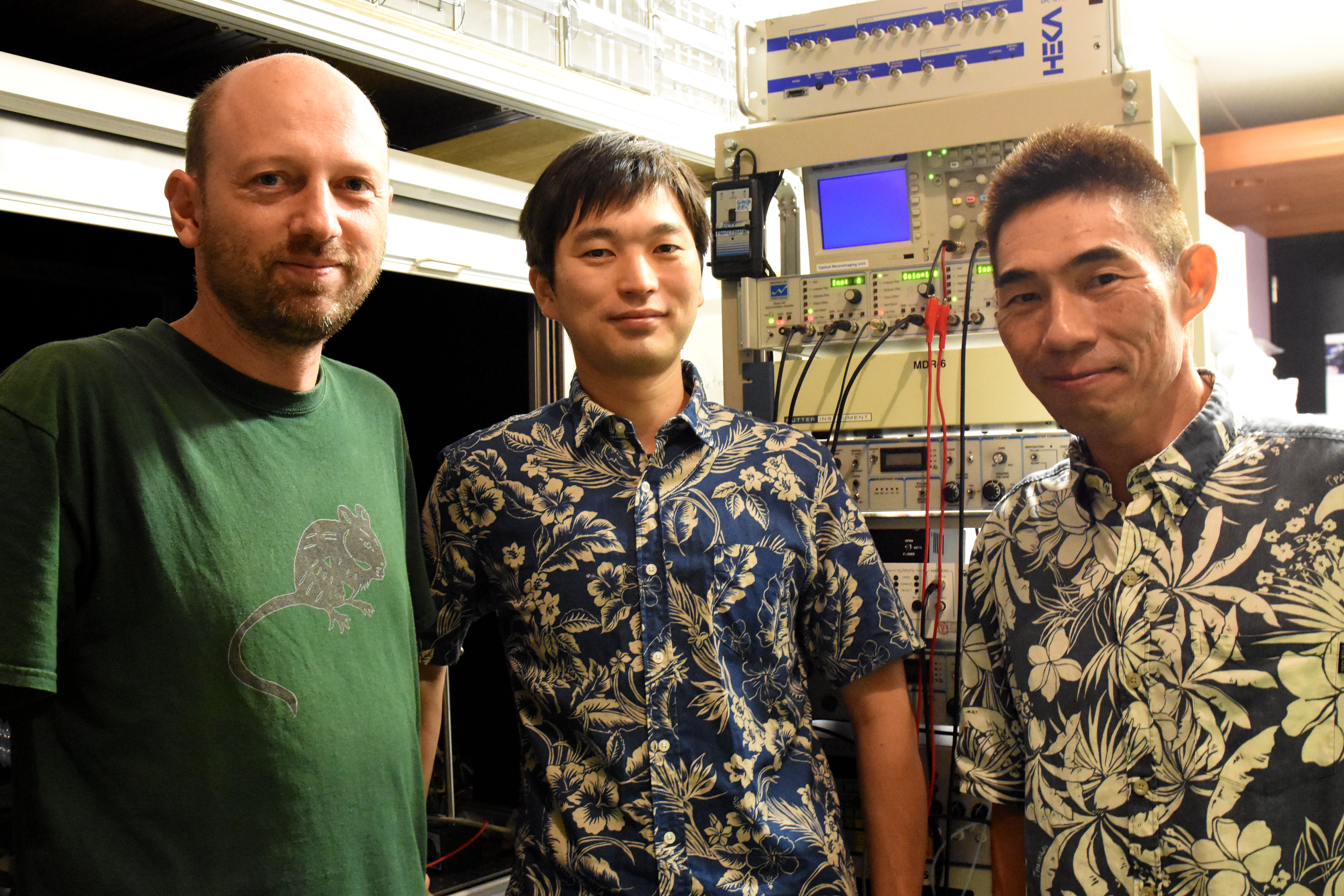 Prof. Bernd Kuhn, Dr. Akihiro Funamizu and Prof. Kenji Doya post in front of lab equipment.