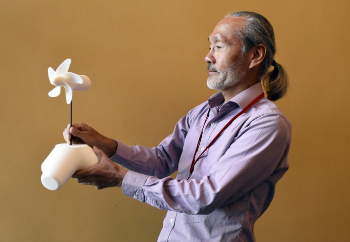 Prof. Shintake holds a model of a wave energy converter turbine.