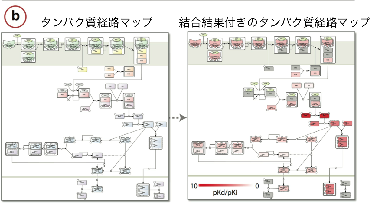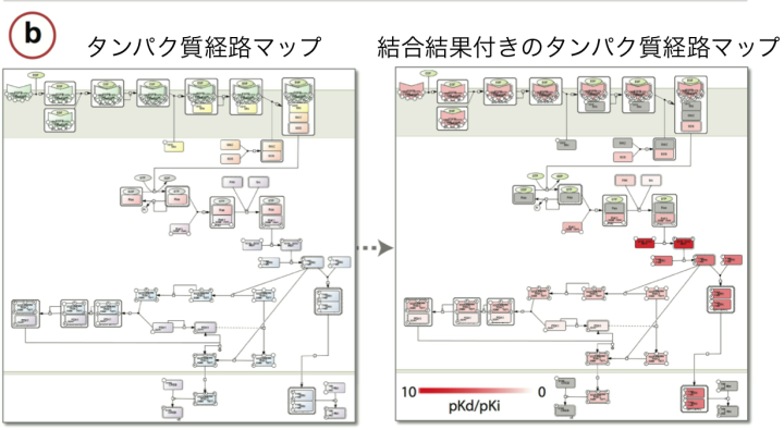 Protein Pathway Map. Docking scores, the predicted ability of the small molecule to bind with all of the network proteins, are converted into a white-to-red color scale. Colored results are then projected to the network map to directly display predicted binding abilities. Through the colored network map, researchers can efficiently investigate potential bioactivity of small molecules against numerous proteins and whole networks of proteins.