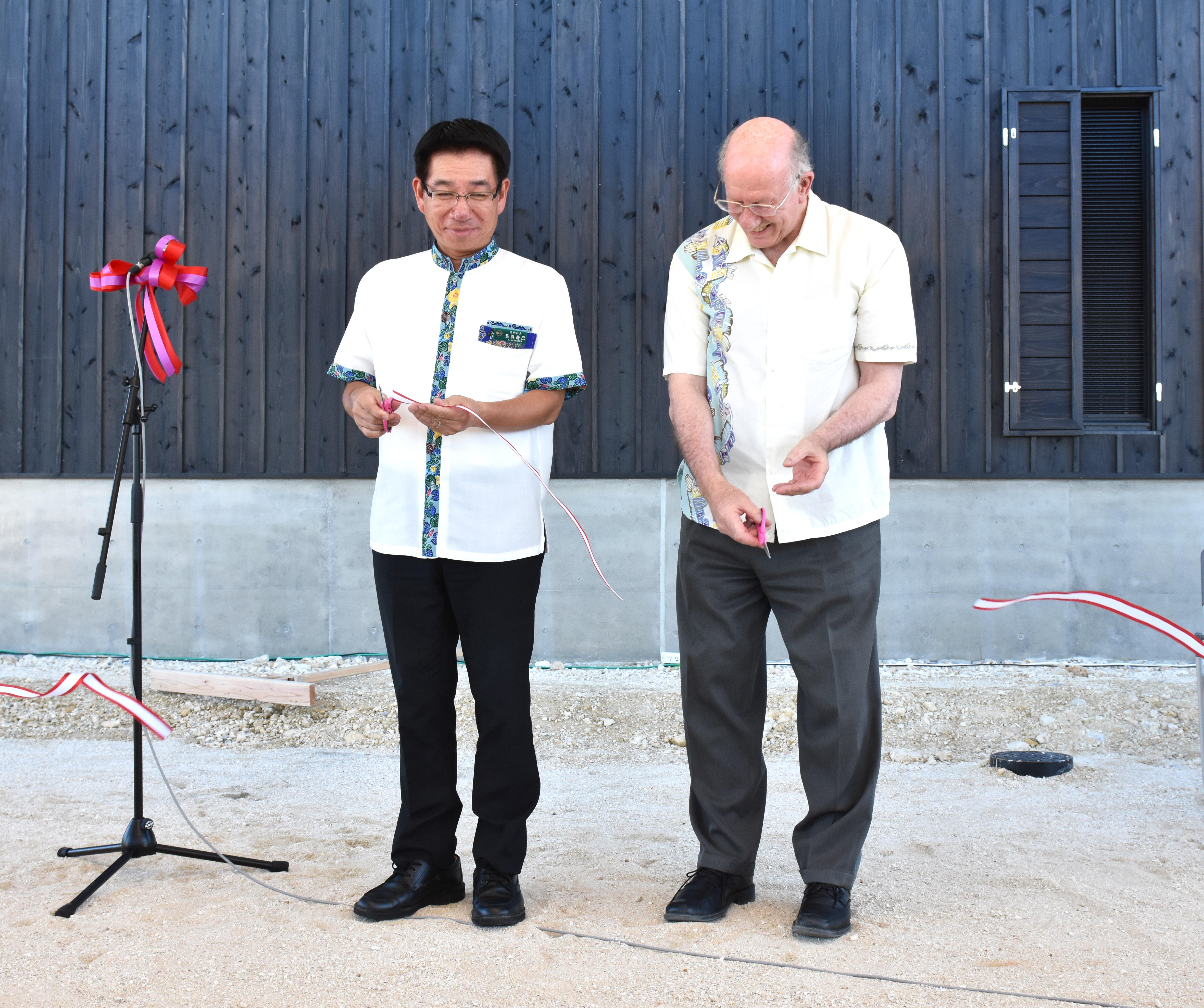 Onna Village Mayor Yoshimi Nagahama and OIST President Jonathan Dorfan cut the ribbon that symbolizes the opening of the OIST Marine Science Station.