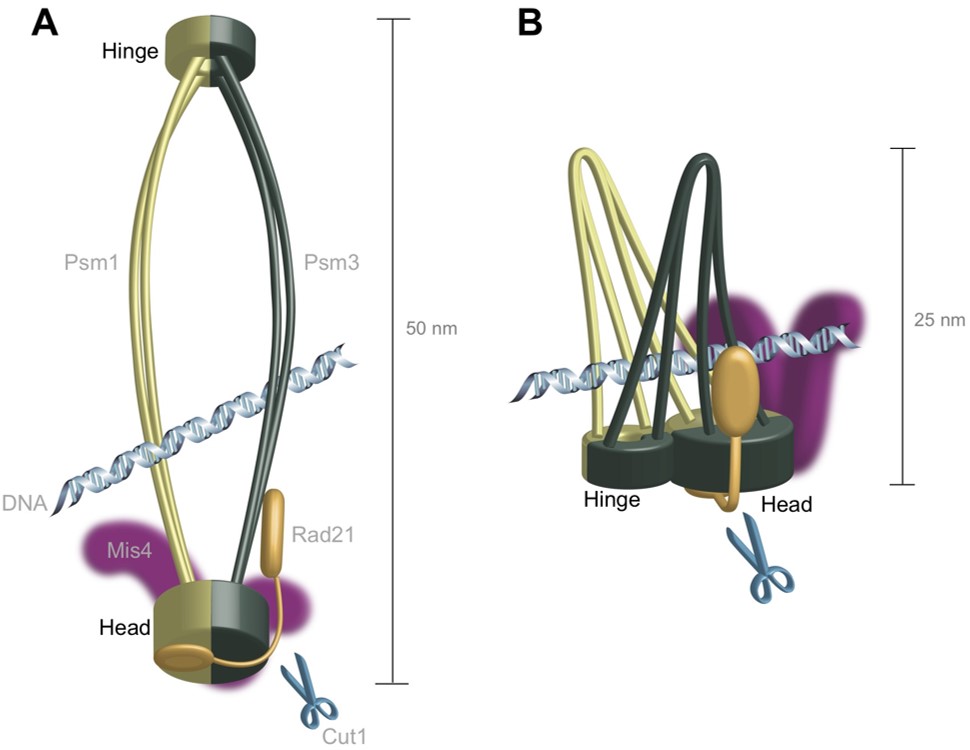 These diagrams compare the two models of the cohesin protein’s structure. The ring model has distinct “head” and “hinge” features at opposite ends of the molecule, whereas the hold-and-release model suggests these features are located next to one another, which would mean the protein could hold DNA like a pair of pincers.