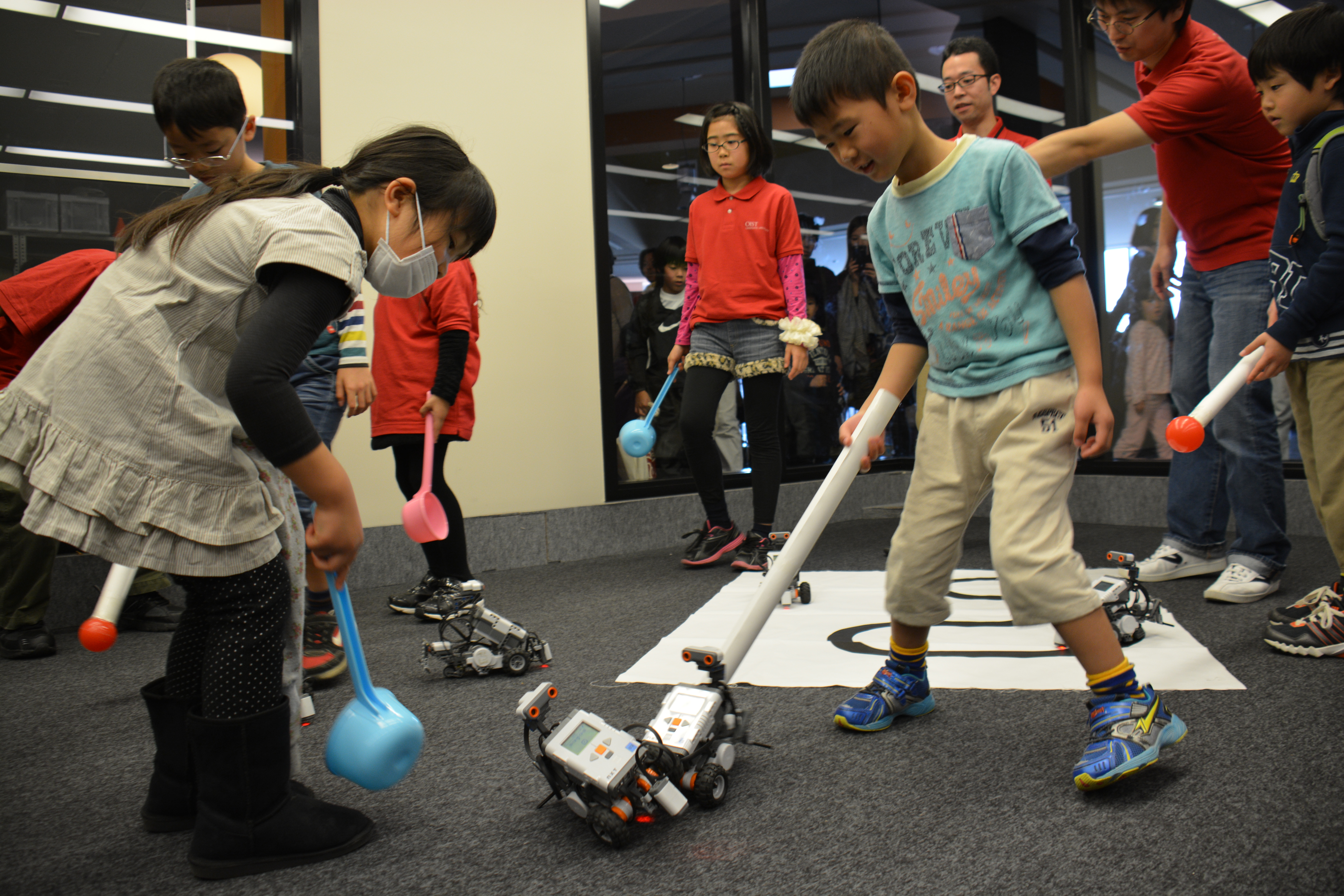Children tap robots to direct them around the floor during 2015 Open Campus.