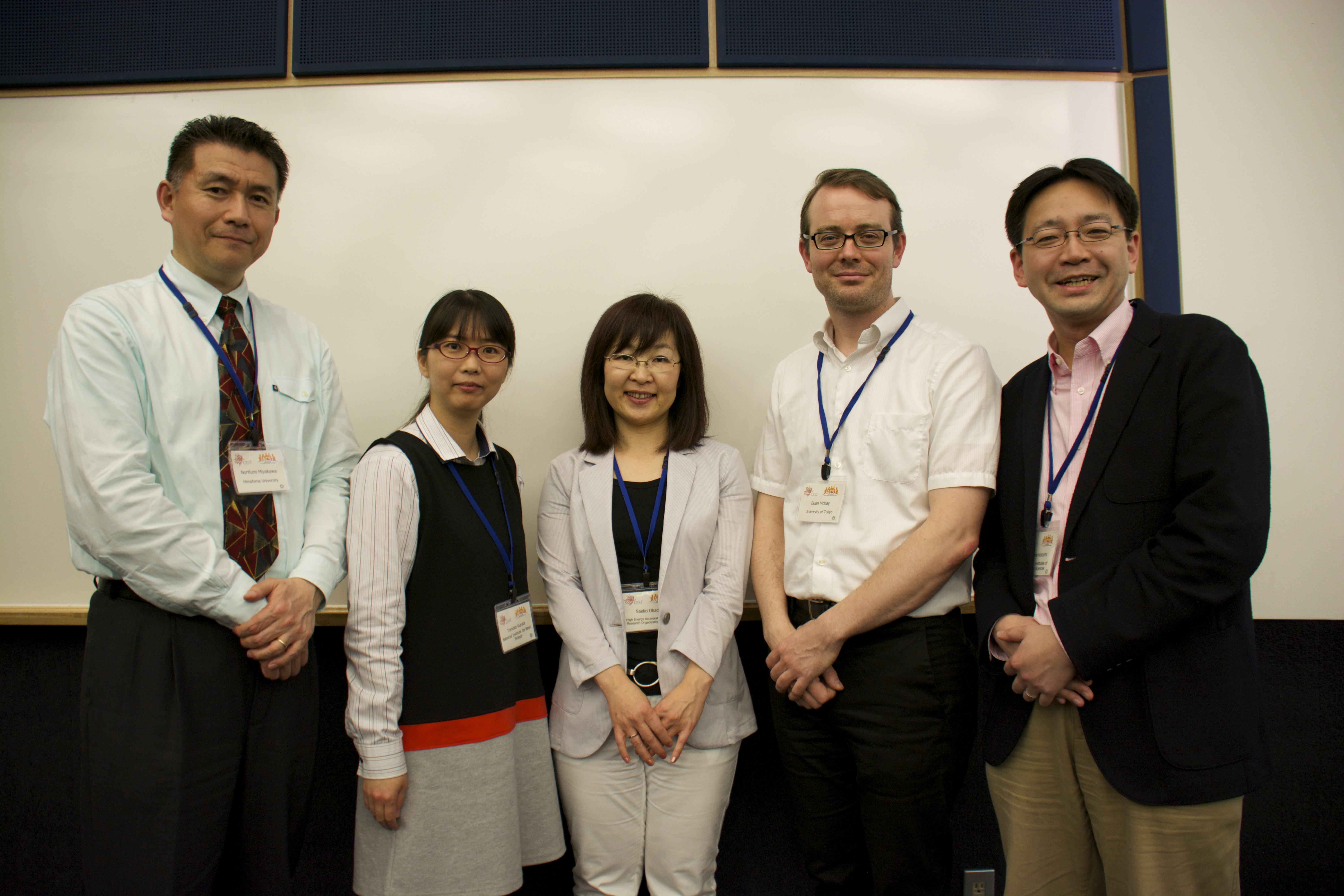 Press officers shared their experiences and challenges publishing press releases about Japanese science in English during a presentation titled “Why Do We Care?” at the International Science Communication Workshop. From left: Norifumi Miyokawa, senior research administrator from Hiroshima University, Tomoko Kurata, specially appointed assistant professor at the National Institute for Basic Biology, Saeko Okada, senior press officer at the High Energy Accelerator Research Organization (KEK), Euan McKay, project researcher in the University of Tokyo Public Relations Office, and Amane Koizumi, project professor at the National Institutes of Natural Sciences.