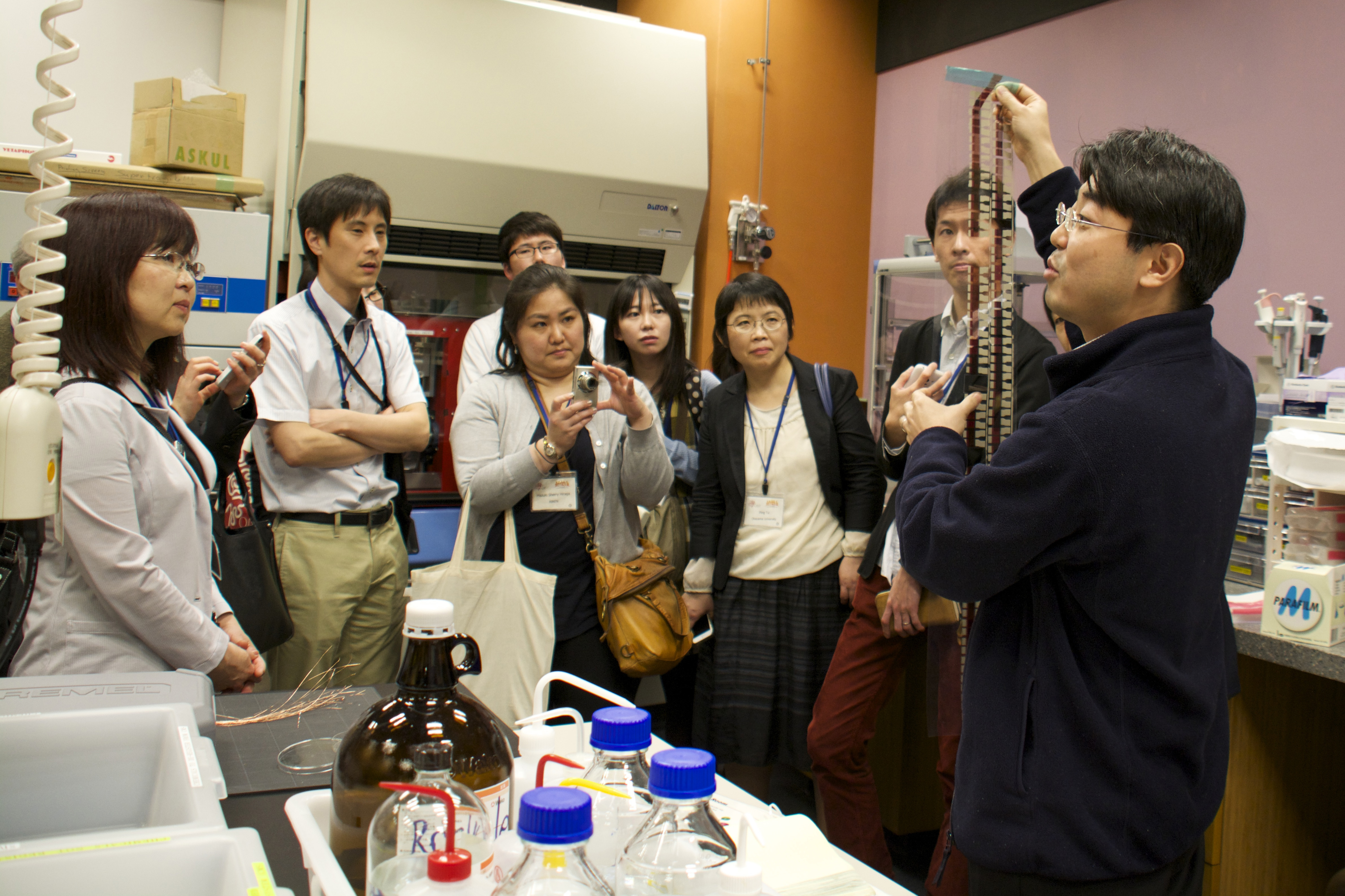 OIST researcher Luis Ono showed attendees of the International Science Communication Workshop around the Energy Materials and Surface Sciences lab during a campus tour.