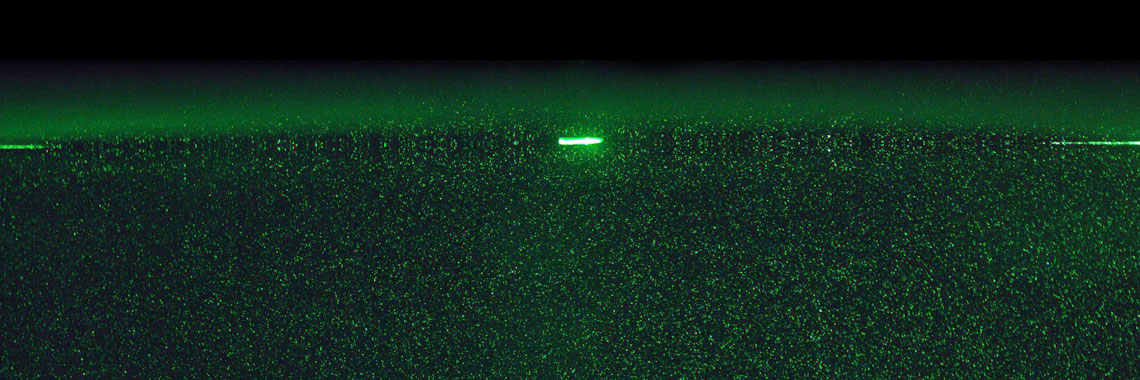 A still frame from a video captured by researchers, this greenlit image shows the distribution of particles in water and a surfactant at its surface.