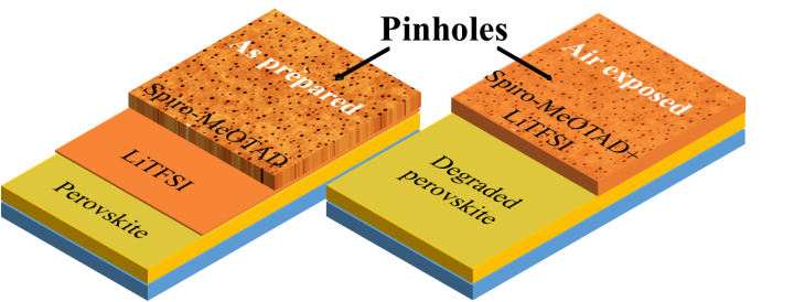 Most high-performance solar cells under development layer spiro-MeOTAD on top of perovskite, with other trace elements added to increase electrical conductivity. Pinholes in the top layer enable water and other molecules in air to diffuse through the thin film and degrade the perovskite, reducing its lifespan.