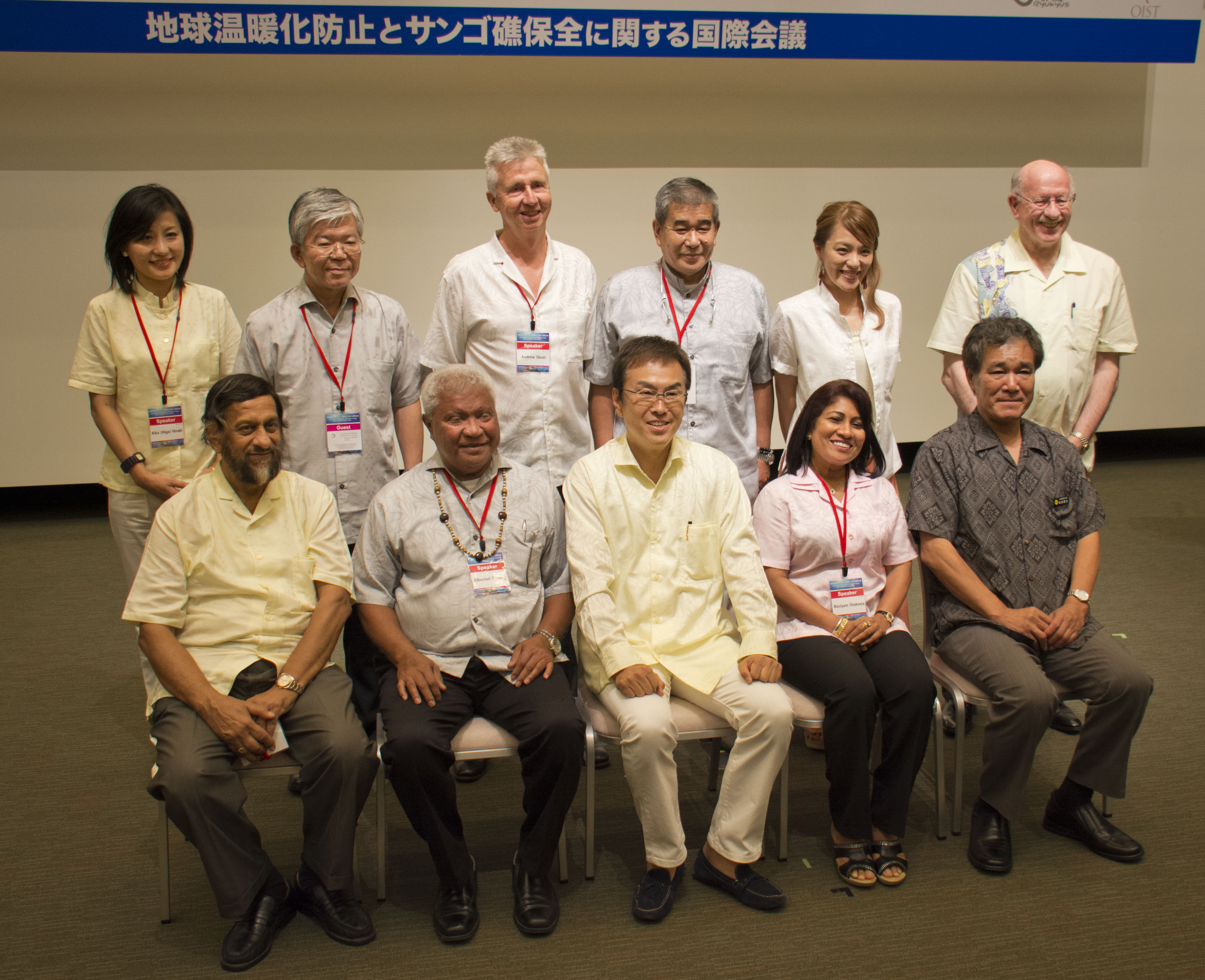 On June 29 and 30, the International Conference on Climate Change and Coral Reef Conservation (organized by the Ministry of Environment and Okinawa Prefecture with the support of OIST and the University of the Ryukyus) was held at the OIST campus. From left in the first row: Rajendra K.Pachauri (IPPC Chair/India), Nobuteru Ishihara (Minister of the Environment), Mariyam Shakeela (Minister of Environment and Energy/ Maldives), Kurayoshi Takara (Vice Governor of Okinawa Prefecture). From left in the second row: Rika Hiraki (NPO Japan Ecotourism Society member/Japan), Hajime Oshiro (President of the University of the Ryukyus/Japan), Andrew Skeat (Great Barrier Reef Marine Park General Manager/Australia), Shiro Wakui (Professor at the Faculty of Environmental and Information Studies, Tokyo City University), Eriko Imai (Member of popular music group SPEED), Jonathan M. Dorfan (President of OIST)