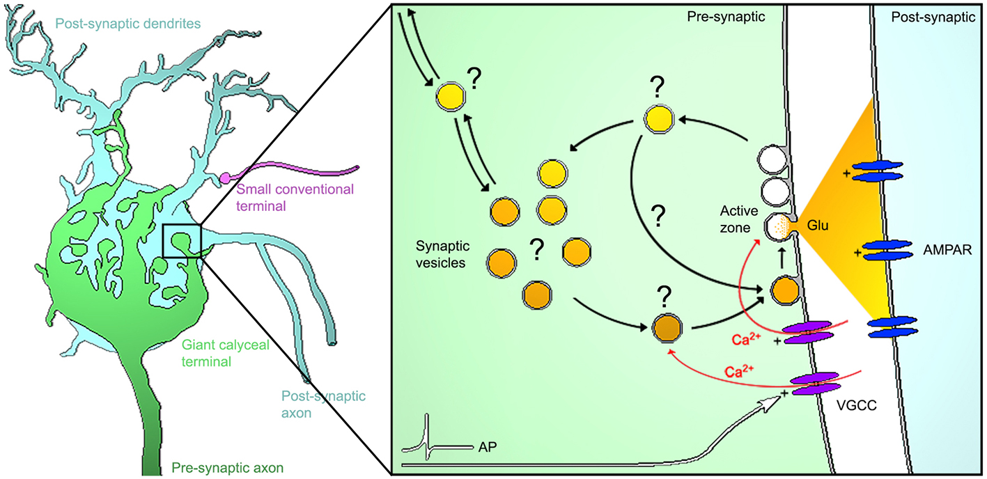 Left) Schematic representation of giant synapse from the mammalian auditory brainstem in lab cultures. Notice the large pre-synaptic terminal (green) surrounding the postsynaptic cell (blue). A small conventional terminal (purple) is shown for comparison. Right) Diagram of synaptic vesicles cycle, showing vesicles fusion and retrieval events, and vesicle distribution and movements in pre-synaptic terminal.