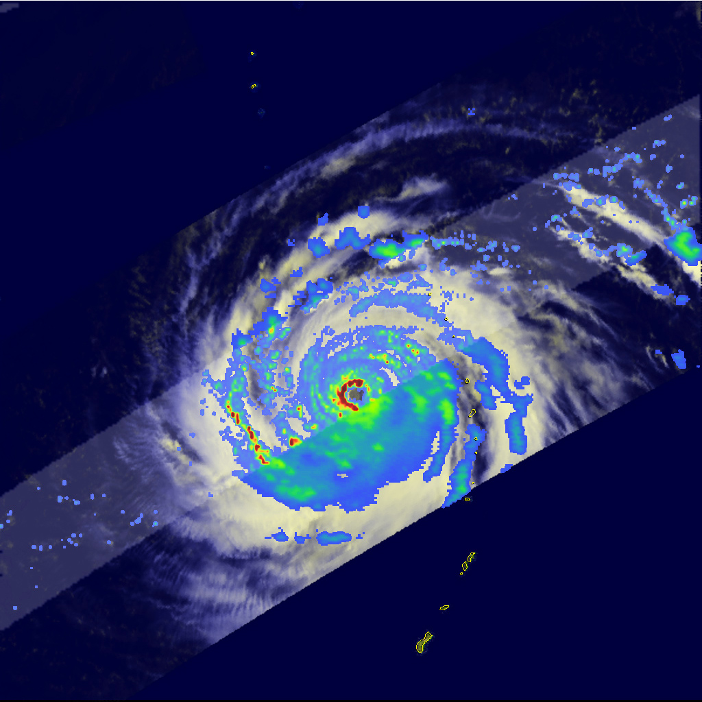 Heaviness of rainfall around the typhoon’s center is marked by red, green and blue in that order. Areas with the heaviest rainfall, in red and green are around the central column. The Tropical Rainfall Measuring Mission (TRMM) satellite which captured the image is a joint mission between NASA and JAXA.