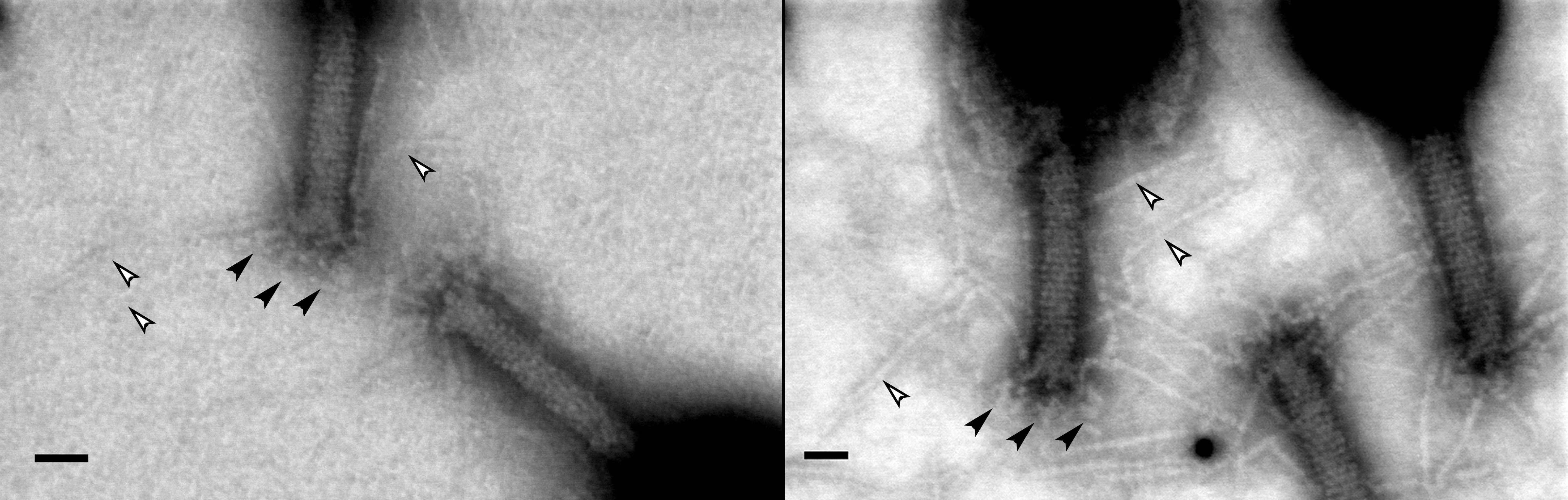 Electron Microscopy images of bacteriophage T4 viruses. The left image was made using conventional carbon film, the right image using the single atom thin graphene layer. More details about the tail and the limbs of the viruses can be discerned. The black bar used for scale is 20 nanometers (0.00000002 meters).