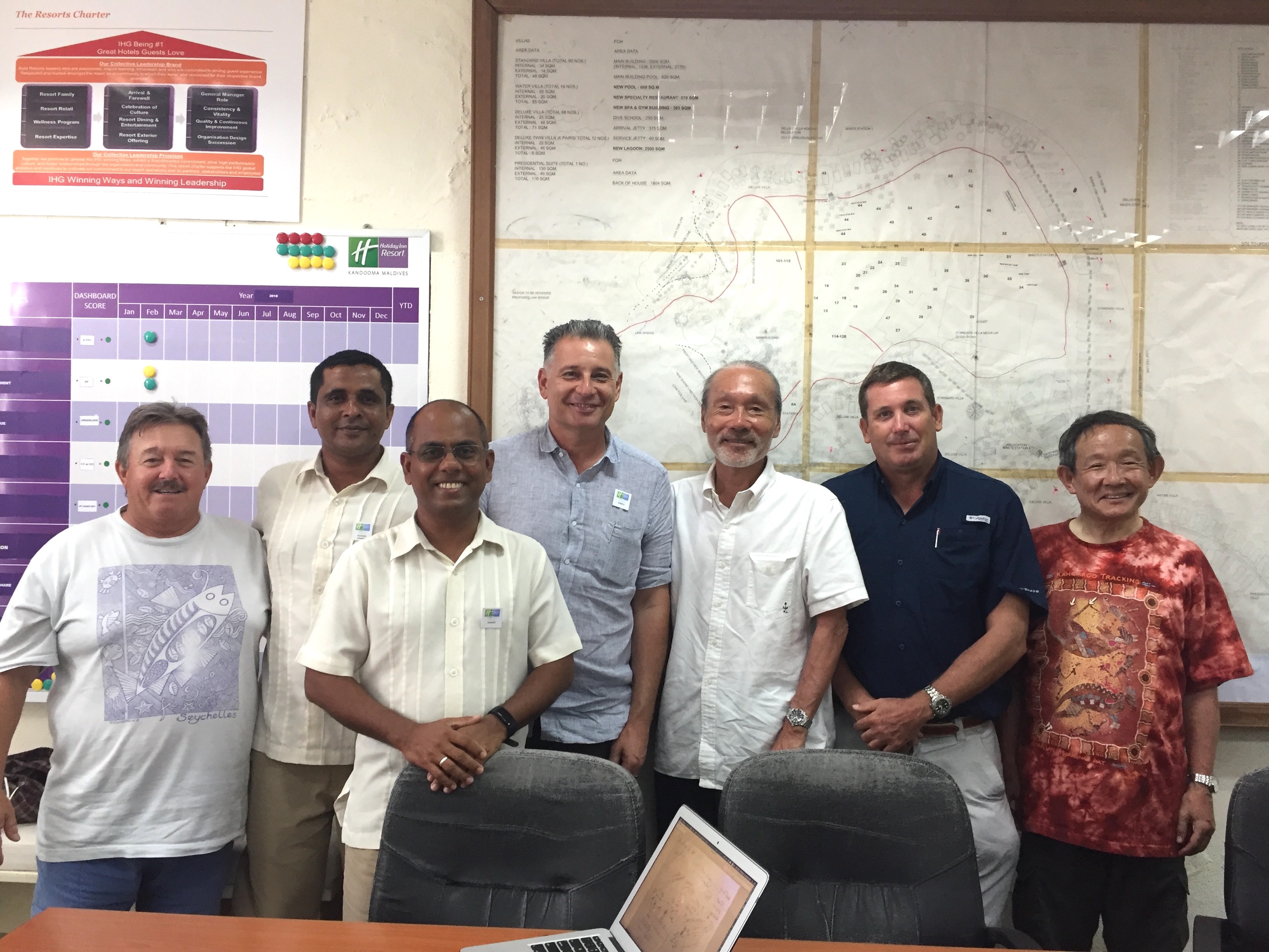 The Wave Energy Project is kindly supported by Holiday Inn Resort Kandooma Maldives. From left to right: Mr. Glenn Crandall, Mr. Hussain Hameed, Mr. Hussain Shahid, Mr. Joseph Della Gatta, Prof. Tsumoru Shintake, Mr. Hamish Taggart, Mr. Tetsu-nori Koyama.