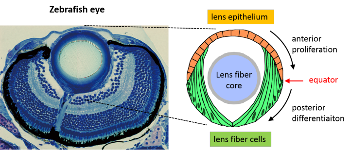 Left panel indicates zebrafish eye. Right drawing indicates diagram of lens development. Lens epithelial cells (orange) form a monolayer covering the spherical lens fiber core, in which lens fiber cells are piled up. The red arrow points to the lens equator, where lens epithelial cells differentiate into lens fiber cells (green).
