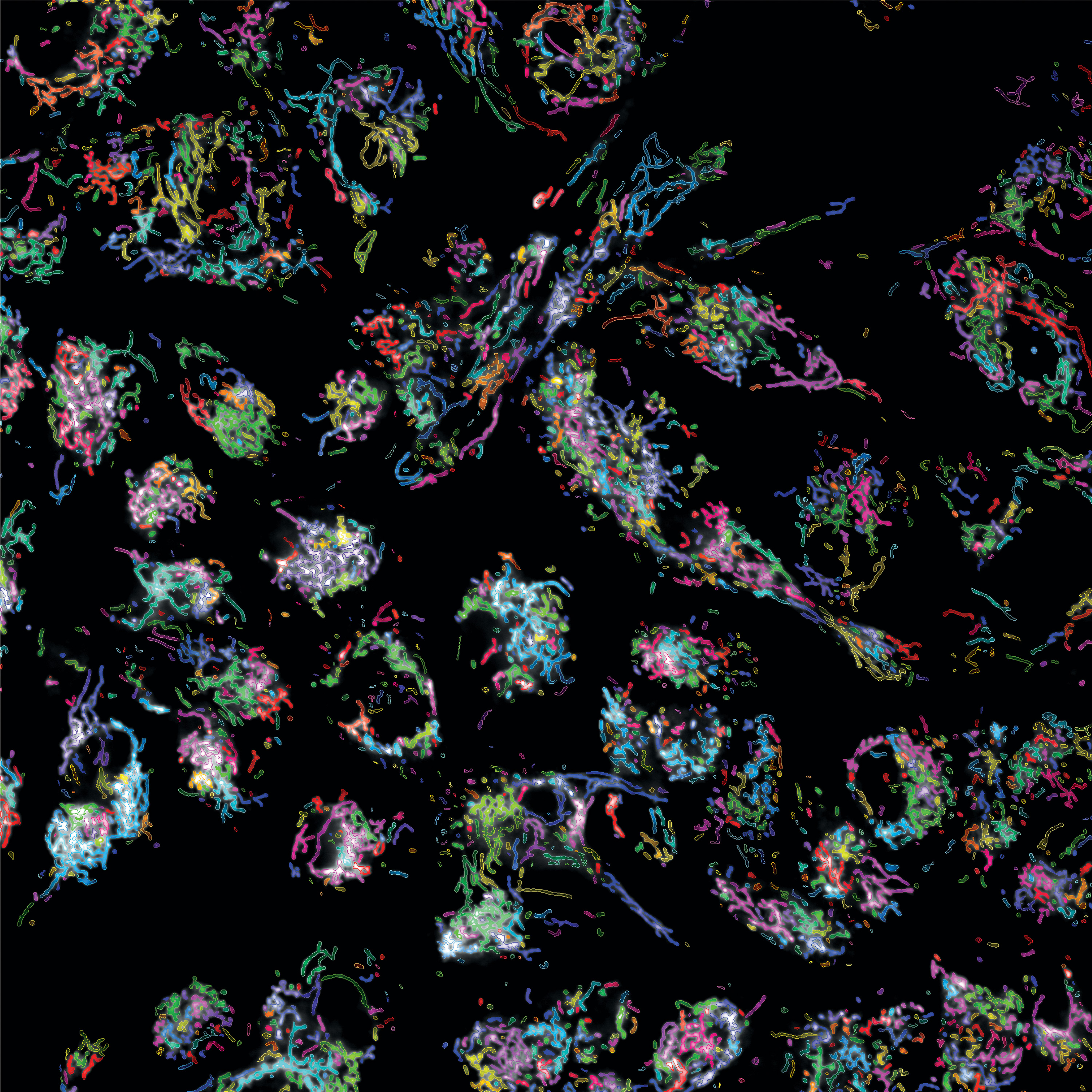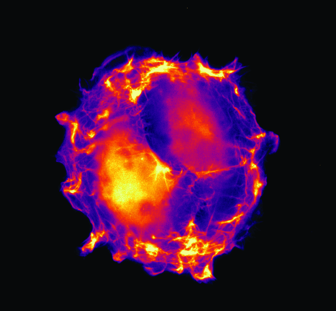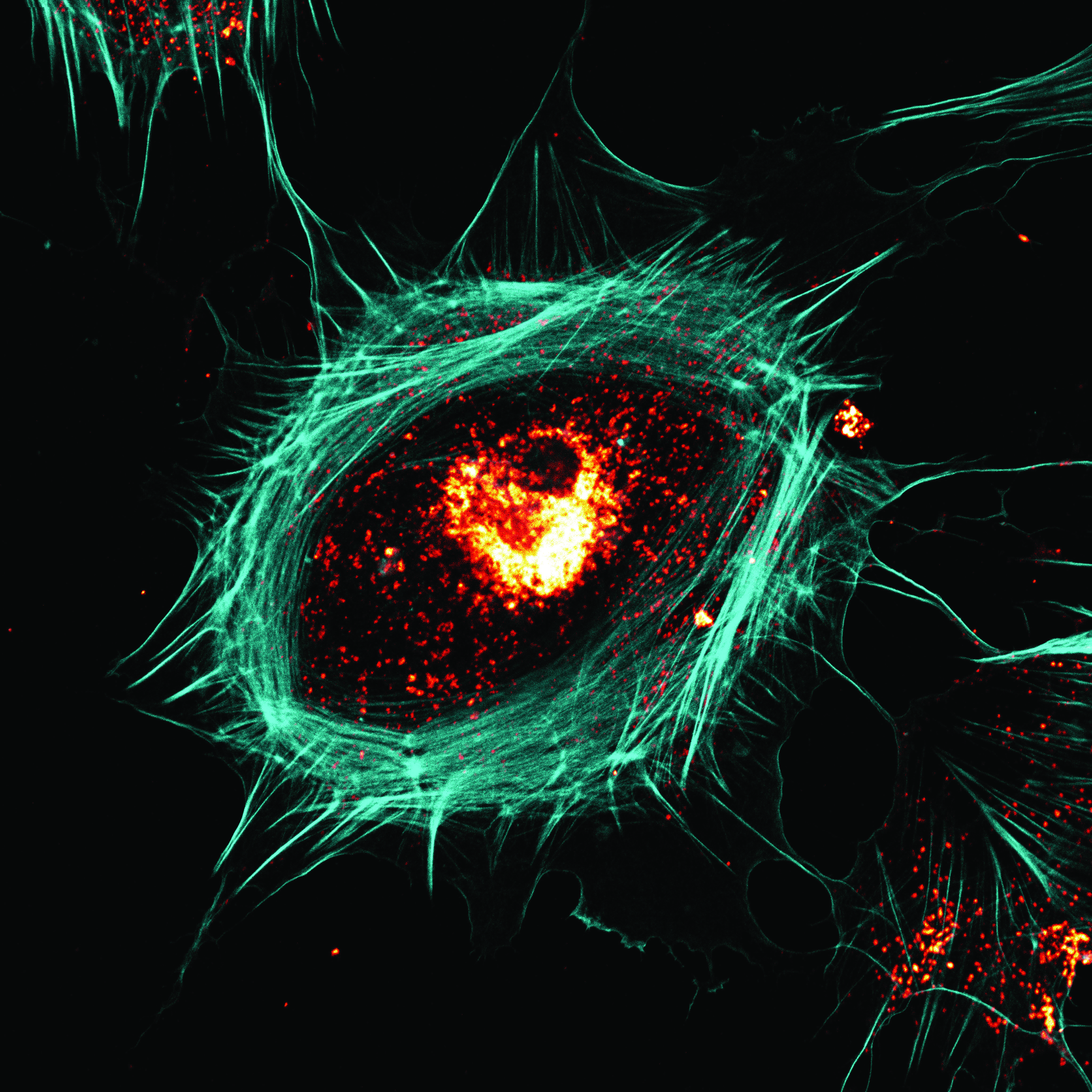 この画像は、分裂回数の限界まで培養を続けることで、細胞周期が停止し複製老化に至ったヒト線維芽細胞(WI-38)を示しています。複製老化とは、体細胞が分裂を繰り返すことで染色体末端のテロメアが短縮し、ヘイフリック限界と呼ばれる分裂回数の限界を迎え、不可逆的な増殖停止に至ることによって特徴づけられる生物学的現象です。この2次元画像は、40倍の対物レンズを装着したZeiss 780共焦点顕微鏡を用いて2023年に取得されたものです。画像取得に先立ち、老化細胞を固定し、抗LAMP1抗体(特定の小胞-リソソームを示す黄色-オレンジ色-赤色の部分)と phalloidin-Alexa-488(細胞骨格を可視化するシアン色の部分)で染色しました。