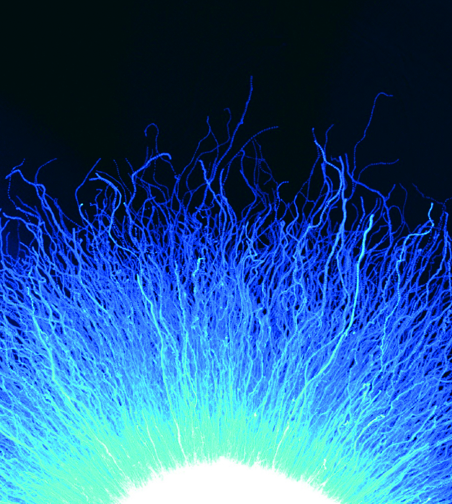 強力な免疫反応として、感染や炎症時の免疫細胞の協調的な動きが挙げられます。細胞はどのようにして移動すべき場所を知るのでしょうか? 免疫細胞の一種、いわゆる樹状細胞は、生体の自然反応と適応反応をつなぐメッセンジャーのような重要な役割を果たしています。樹状細胞の移動は、リンパ節から放出される小さなシグナル伝達タンパク質であるケモカインによって誘導されます。Sixt グループの Jonna Alankoは、樹状細胞が移動する際、ケモカインを細胞内に取り込み、局所的なケモカイン濃度を減少させ、その後再び濃度の高い場所に移動することを実証しました。これにより樹状細胞は、リンパ節に向かう経路を容易に見つけることができ、集団移動をより効果的に行うことができるのです。樹状細胞の移動経路を可視化するため、Alankoは、数時間にわたる樹状細胞の軌跡を投影しました。