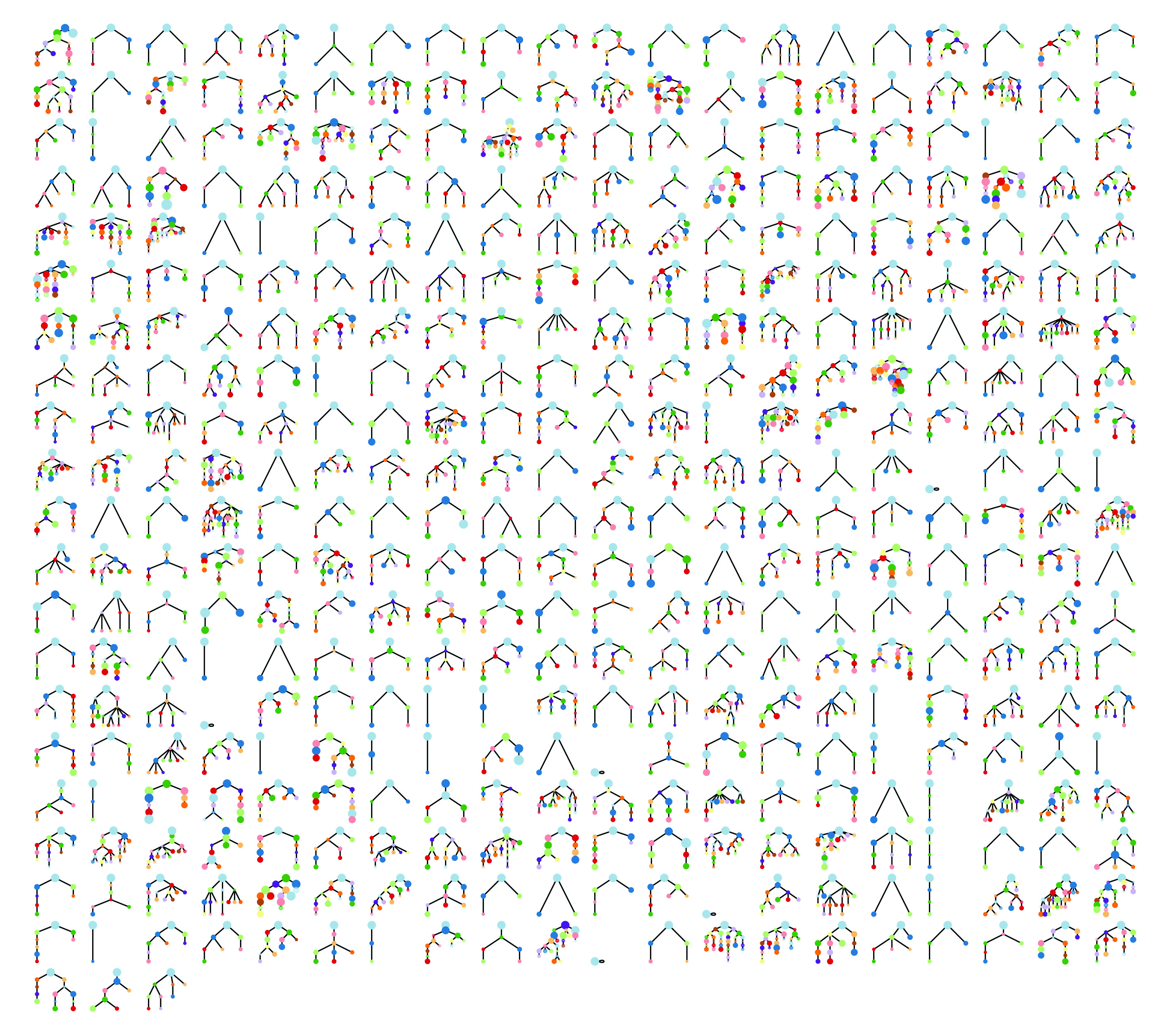 この画像は、未治療の早期非小細胞肺癌患者400人以上の腫瘍進化系統樹を再構成したものです。各系統樹は1つの腫瘍の進化の歴史を表し、各枝は異なる変異セットを持つ癌細胞の亜集団(サブクローン)を表しています。