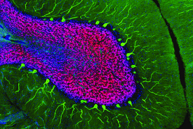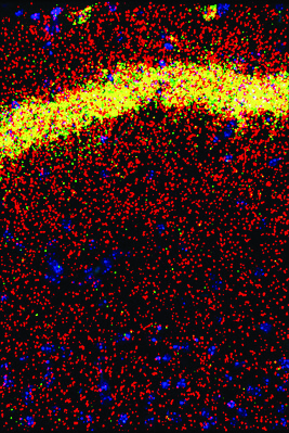 脳のニューロンは結合によって複雑な網状構造を形成しています。ニューロンがこれらの結合を絶えず適応させ、新しい結合を作り出すことにより、記憶が形成されるのです。ロックフェラー大学のRobert B. Darnellと彼の研究チームは、このような活動を起こさせる脳内の遺伝子とタンパク質の複雑な相互作用を研究しています。チームは、特殊な光の下で、種々のタンパク質がそれぞれ異なる色で光るように細胞の遺伝子を組み換えることによって、ニューロン内のタンパク質を可視化できるようにしました。