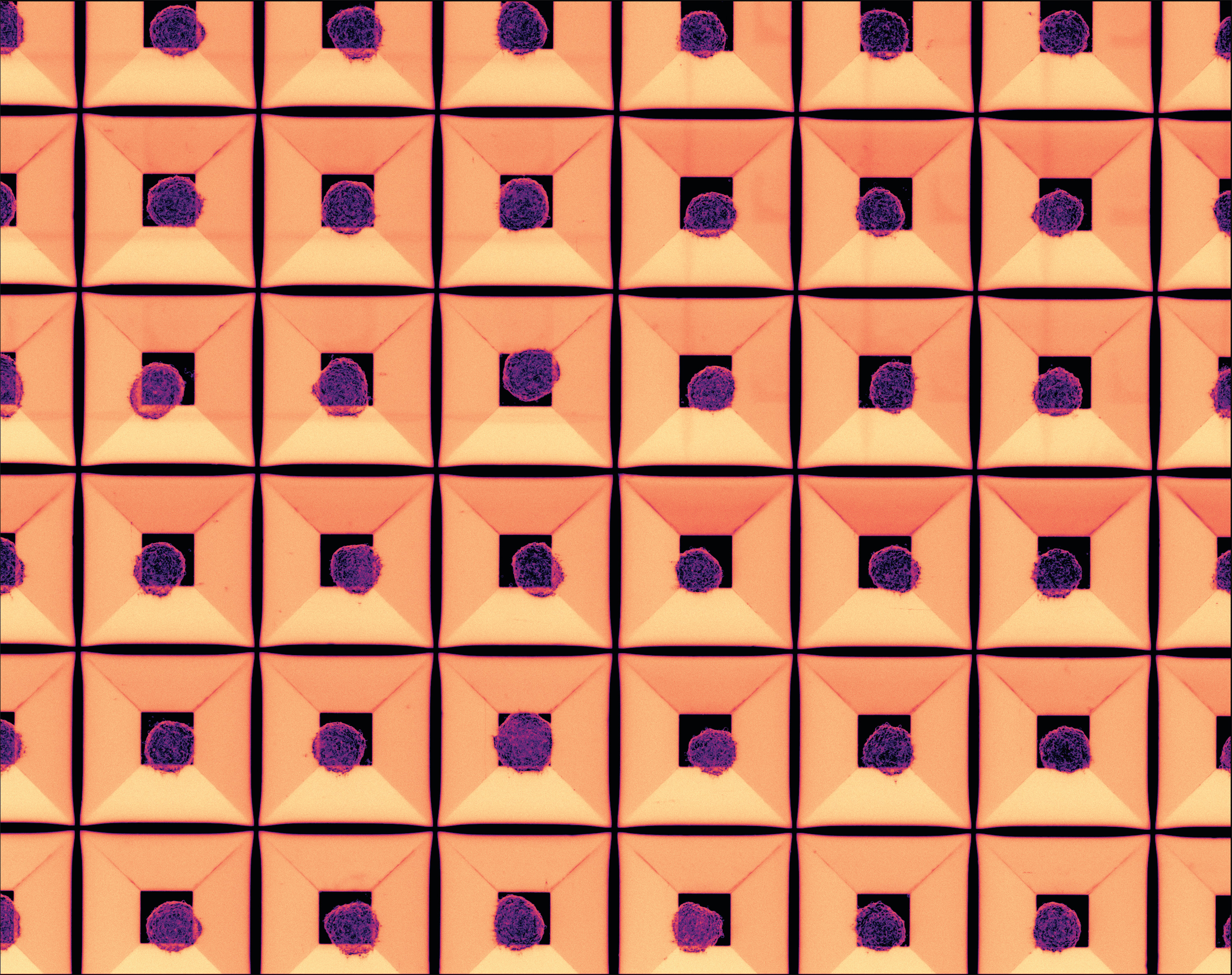 この画像は、個々を分析するため、数千個のメラノーマ皮膚がん細胞を3次元的に増殖させたものです。がん細胞をマイクロウェル1個につき1個ずつ播種して、最大20,000個のマイクロウェルを含むプレート内で、並行して増殖させることができます。増殖する表面がない場合、がん細胞は分裂と増殖を続け、スフェロイドと呼ばれる球状の構造体を形成します。このスフェロイドは腫瘍を模倣した実験に利用することができます。
