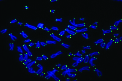 DNAは驚くほど細長い分子で、細胞の中で折りたたまれて染色体と呼ばれる構造をとります。DNA鎖の末端は特別なDNAの配列によってテロメアと呼ばれる構造をとることにより保護されていますが、このテロメアは加齢とともに短くなります。ロックフェラー大学のTitia de Langeらの研究チームは、このテロメアの短縮が体内で腫瘍の成長を抑制するのにどのように役立っているのか、またテロメアが、DNA修復機構とどのように相互作用しているのかを研究しています。画像はヒトの染色体を青で、テロメアを緑で示しています。