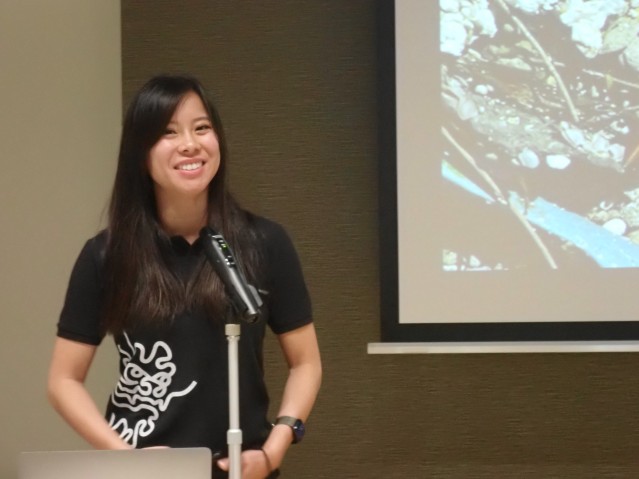 Samantha Phan, a postdoctoral scholar at OIST, gave a lecture at a science talk hosted by OIST at the Okinawa Prefectural Library in Naha.