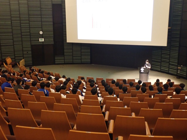 84 students from Urasoe High School in Okinawa visited OIST. Temma Fujishige, an OIST Ph.D student from the Tani Unit (Cognitive Neurorobotics Research Unit), gave a lecture about his research and career path.