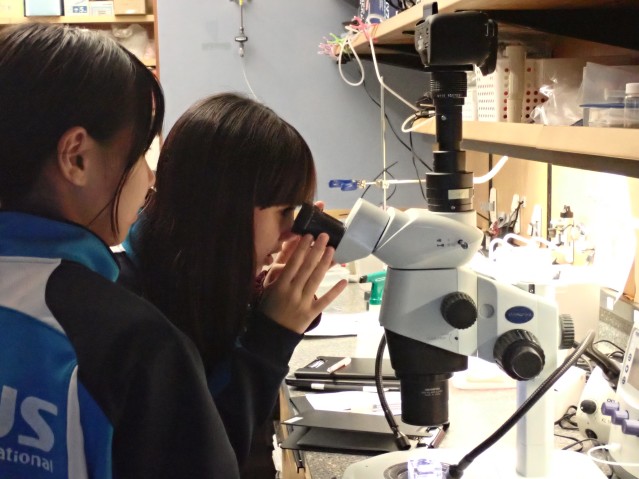 The students observed samples such as squid using microscopes in the laboratory, practiced using pipettes, and took a tour of the lab. The students also learned about the job of public relations and an interpreter.