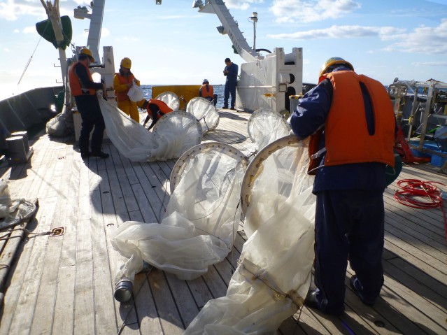 Aboard the R/V Tansei-maru: JAMSTEC's Research Vessel Tansei-maru, on a cruise during the end of November in 2011. The scientists are preparing plankton nets that are used for deep sea sampling.