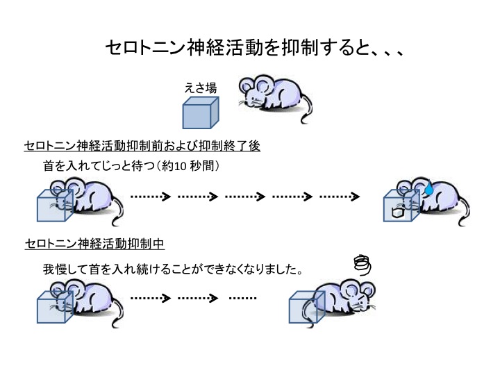 Researchers implanted a microdialysis probe into a part of the brain called the dorsal raphe nucleus (DRN), then tested rats’ performance on a waiting test before and after a serotonin-suppressing drug was delivered through the probe. In the test, five rats were trained to alternately visit a food site and a water site, where they had to poke their noses into a hole and wait for a reward in the form of either a food pellet or water. Sometimes the wait was only two seconds, while other times the reward wouldn’t arrive until seven to eleven seconds of waiting. While untreated rats were usually able to keep their noses in the hole for as long as it took to get the reward, once the suppressor was delivered, reducing the amount of serotonin in the DRN by more than half, the rats became much more likely to wander off if not rewarded after a few seconds.