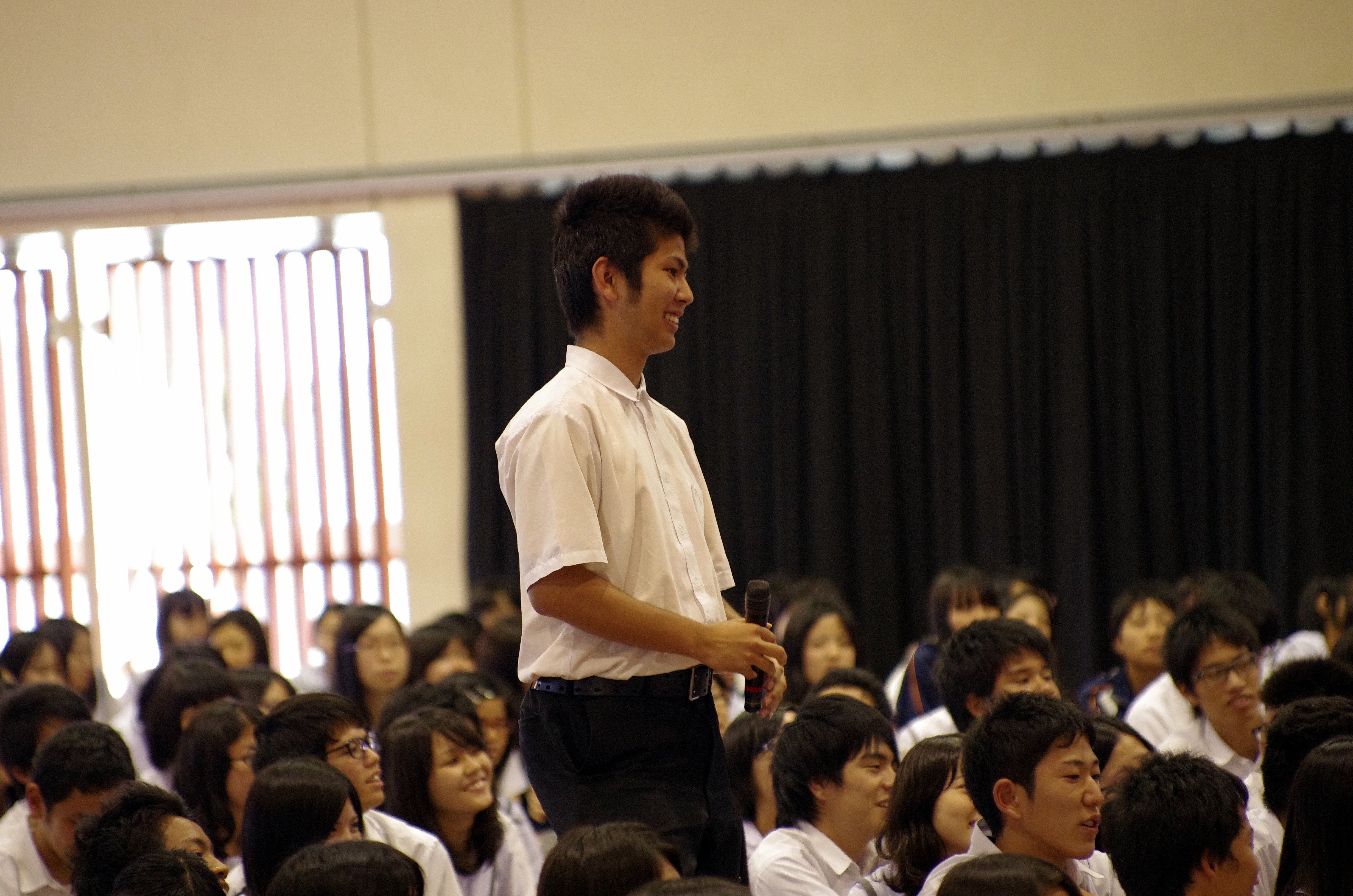 A Kaiho High School student asks a question following Jerome Friedman's talk
