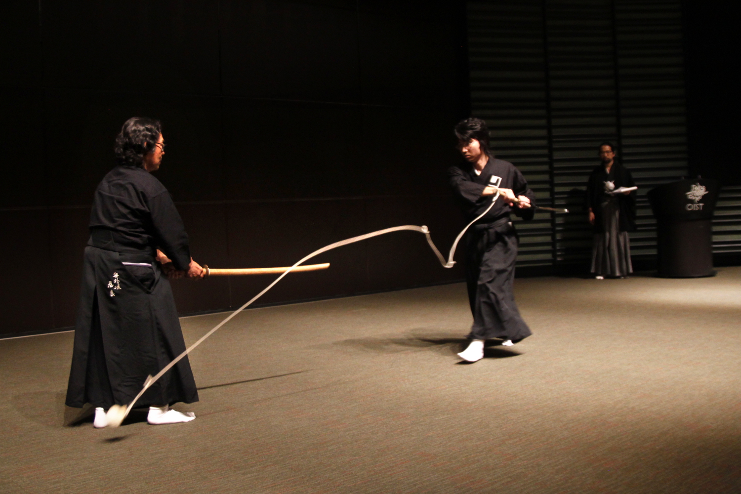 OIST Provost Robert Baughman, Akira Miyagi, and translator Risa Sato address the gathering.