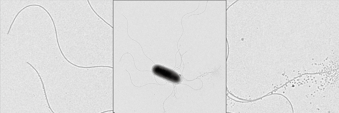 An image of a salmonella bacterium showing its flagella, taken with an electron microscope with the help of OIST’s Toshio Sasaki