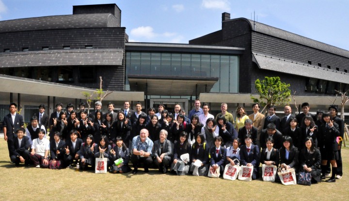 The SCORE! contestants gather in the Center Court with the judges, including: Neil Calder, VP Communications and Public Relations; Jessica Webster, Minister Counselor for Economics and Science Affairs of U.S. Embassy in Tokyo; and Mr. Alfred R. Magleby, United States Consul General in Naha.