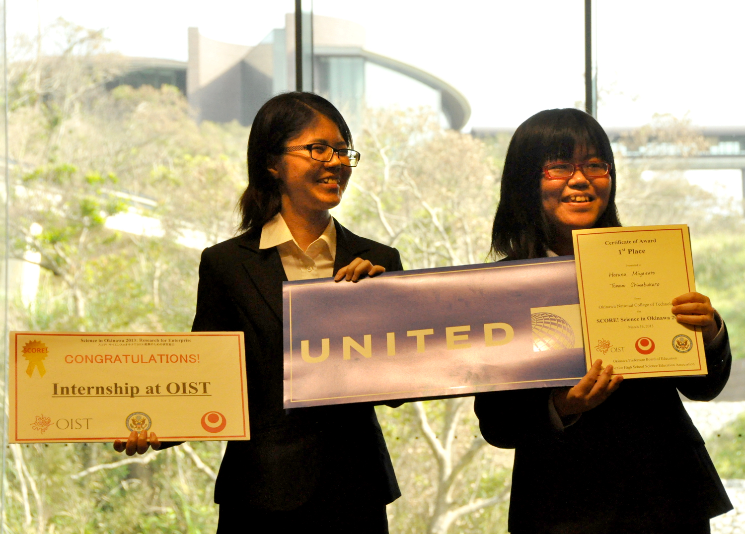 1st Prize went to Haruna Miyazato and Tomomi Shimabukuro from Okinawa National College of Technology (ONCT) for their project on manufacturing anti-aging cosmetics from the discarded peels of the Okinawan citrus fruit, shekwasa.