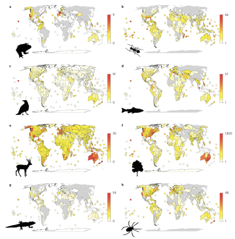 - Dawson, W., Moser, D., Van Kleunen, M., Kreft, H., Pergl, J., Pyšek, P., Weigelt, P., Winter, M., Lenzner, B., Blackburn, T. M., Dyer, E. E., Cassey, P., Scrivens, S. L., Economo, E. P., Guénard, B., Capinha, C., Seebens, H., García-Díaz, P., Nentwig, W., García-Berthou, E., Casal, C., Mandrak, N. E., Fuller, P., Meyer, C., Essl, F. Global hotspots and correlates of alien species richness across taxonomic groups. Nature Ecology & Evolution, doi: 10.1038/s41559-017-0186 (2017).