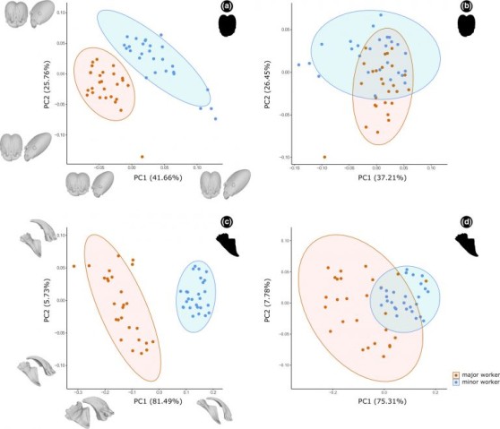 First, our now postdoc Ale Casadei-Ferreira and colleagues analyzed ecology-mandible correlations and integration in the evolution of mandibles and head shape, focusing on Pheidole majors and minors.