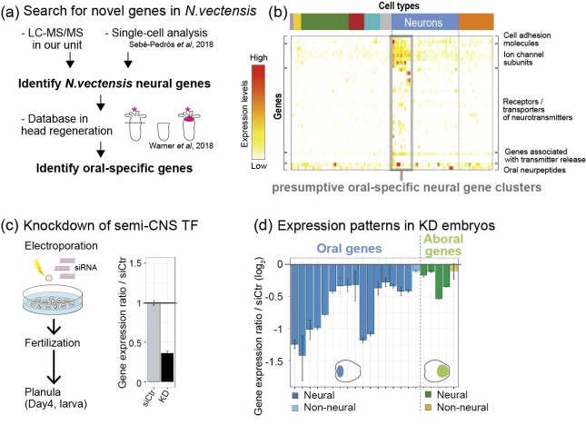 It remains unanswered whether ancestral bilaterian had a central nervous system (CNS) or not. We performed comparative genome and developmental analyses of the cnidarian semi-CNS developing at their oral region. Cnidaria is the closer sister group to all bilaterians (Fig. 2). Our analyses have so far demonstrated that the cnidarian semi-CNS comprises of 3 oral-regionalized neuropeptides and 7 bilaterian CNS-associated genes which are highly conserved in bilaterian CNS. To understand the developmental mechanism of cnidarian semi-CNS, we performed the siRNA-mediated knockdown (KD) of a semi-CNS transcription factor genes (semi-CNS TFs) in N. vectensis. (Fig. 3). We found the expressions of the semi-CNS genes are significantly downregulated by knockdown of semi-CNS TFs, implying the common neurodevelopmental mechanism is functioning in both cnidarian oral semi-CNS and bilaterian CNS.