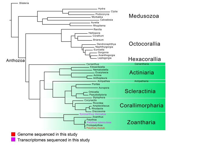 The early-branching animals such as cnidarians have possessed important evolutionary information for understanding the emergence of body plan complexity. By decoding genomes and transcriptomes of selected cnidarian species with their evolutionary importance, we aim to understand the origin of central nervous system and its primordial functions. The genome and transcriptomes of several zoantharians, which is one of the basal hexacorallians, have been decoded (Fig 1). Zoantharian larvae bear well-developed bands of cilia along their body axes that is reminiscent of ciliary bands of marine invertebrate larvae. We are interested in the cellular, physiological, and genetic features of the zoantharian nervous systems associated with their larval ciliary bands. This year our unit has deciphered genome of a zoantharian, one of the dominant zoantharian species in Okinawa water. The transcriptomes of its counterparts were also sequenced. Expending both next-generation sequencing and third-generation sequencing data, this project has provided insight into the evolution of metazoan.
