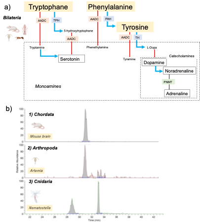 Figure 1. (a)A schematic metabolism of L-aromatic amino acids forming typical neurotransmitters in Bilateria. (b) Mass chromatographic signals corresponding to one of the neurotransmitters of Chordata (1), Arthropoda (2), and Cnidaria (3).3.2 Anatomical and physiological studies of ctenophore nervous systems