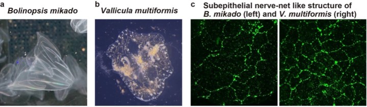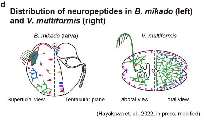 Figure 2. (a) Pelagic ctenophora B. mikado. (b) Benthic V. multiformis. (c) A similar subepithelial nerve-net structure was identified in B. mikado (left) and V. multiformis (right) by immunohistochemical analysis against a neuropeptide. (d) Schematic diagrams for comparison of peptides distribution between B. mikado (left) and V. multiformis (right). The same color indicates identical peptides.3.3 Evolution of the neural centralization