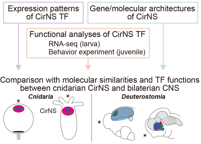 Figure 3. An outline of our experimental scheme to decipher evolutional process of CNS, focusing on the developmental mechanism of oral CirNS in N.vectensis. Our goal is to gain insights into brain evolution when and why animals develop centralized nervous systems.