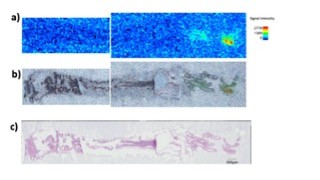 Figure 1: (a) MALDI Ion imaging of one of chemical transmitter (obtained by MIRUION, Osaka Japan). (b) Merged image of the ion image (a) and microscopic image (c). (c) H&E staining.