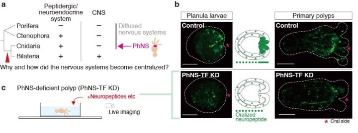 The evolutionary origins of the central nervous systems (CNSs) are still largely unknown (Figure 2a). Homologs of transcription factors (TFs) involved in CNS patterning in Bilateria exists also in cnidarian genomes, but their developmental and physiological functions have not so far been clarified. A comprehensive genome surveys and functional analyses using Nematostella vectensis (Cnidaria) revealed that the genetic features of the cnidarian oral/pharyngeal nervous system (PhNS) share molecular similarities with the bilaterian CNSs. In this year, we generated PhNS-deficient N. vectensis to reveal behaviors involving PhNS function (Figure 2b). A series of behavioral experiments identified neural assemblage expressing neuropeptides and TFs that regulate broad range of mouth/pharynx-related systematic responses in N. vectensis (Figure 2c). Our results suggest that some behavioral and metabolic functions observed in bilaterian CNS were already controlled by functionally localized neural assemblies even in the diffuse nervous system prior to emergence of bilaterian CNSs.