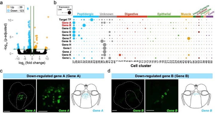Figure 3: (a) Volcano plot of the RNA-seq analysis comparing with control and target TF knocked down. Orange and blue dots indicate up- and down-regulated genes, respectively. (b) Dot plot of target TF and down-regulated genes in M. leidyi scRNA-seq. The dot size indicates the expression level, and the dot color indicates the cell type. (c, d) Fluorescent in situ hybridization images and schematics of the down-regulated genes A (c) and B (d). Scale bars for the whole-body image and zoomed image are 50 µm and 20 µm, respectively.