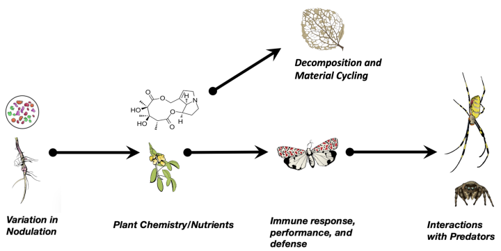 This project, funded through a combination of JSPS Early-Career Kakenhi and JSPS Postdoctoral Fellowships, seeks to understand how variation in plant secondary chemistry affects interactions at other trophic levels. We are focusing on the plant genus Crotalaria, which fixes nitrogen from the atmosphere with the aid of the symbiotic root-nodulating bacteria, Bradyrhizobium. The plant also produces copious concentrations of pyrrolizidine alkaloid chemicals, which are highly toxic to many would-be herbivores. We are investigating how variation in the symbiotic microbial partnership influences alkaloid production by the host plant, and how this variation in alkaloid concentrations influence the communities of herbivores, decomposers, and predators that associate with the plant.