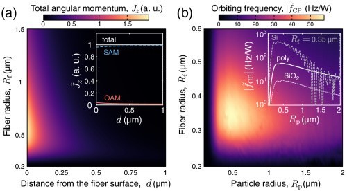 Figure 3. Simulation results. (a) Density of the total angular momentum of light near a nanofibre (in water) guiding a fundamental mode with σ = 1. Inset: total angular momentum per photon and its orbital and spin components. (b) Orbiting frequency for a polystyrene particle, as a function of radii of the particle and the fibre. Inset: frequency at the optimum fibre radius (Rf = 0.35 µm) for three different particle materials: silicon, polystyrene, and silica.